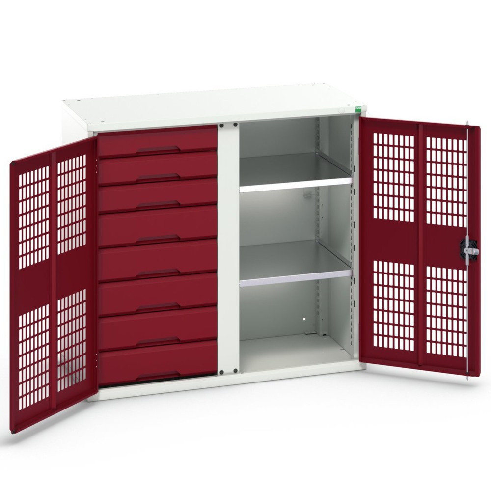 - With sturdy, fully welded steel plate housing, a central vertical partition, two doors with ventilation slots, 2 height-adjustable shelves made of galvanised steel plate (load capacity: 75 kg) and 3 x 100 mm and 5 x 125 mm drawers with full extension (load capacity: 75 kg)